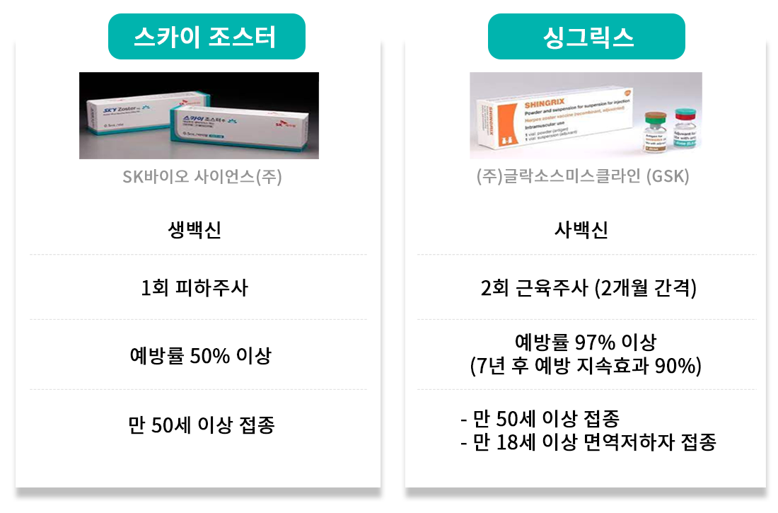대상포진 예방접종(생백신 또는 사백신) 등으로 예방할 수 있습니다.